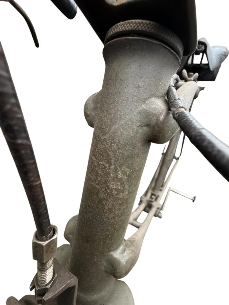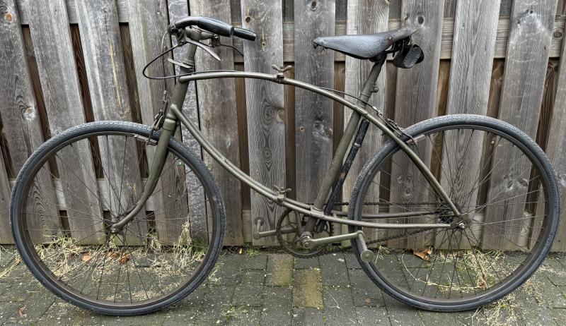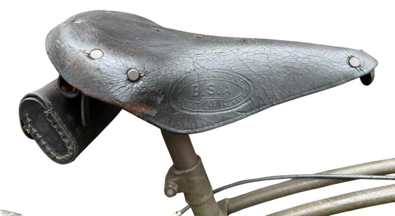 The BSA Folding Bicycle was designed for used by British Paratroopers and could even been carried by a Paratrooper in descend. This particular bike compromises the so-called 2nd pattern. Original wheels, hand brakes and BSA handgrips. The leather saddle is equally BSA makers marked. In clear nice used condition. Fitted with original leather toolkit complete with various tools. An atttractive British (Airborne) BSA Folding Bicycle as used during D-Day and the Battle of Arnhem. Can be upgraded.
