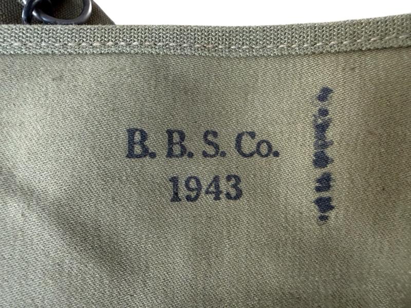 U.S. M1936 Musset Bag. Executed in a waterproofed i.e. rubberized canvas. Clearly 1943 dated and makers marked "B.B.S. Co.". The musset bag is fitted with an original and 1943 carrying strap. Both bag and strap are in mint condition, and cannot be upgraded.