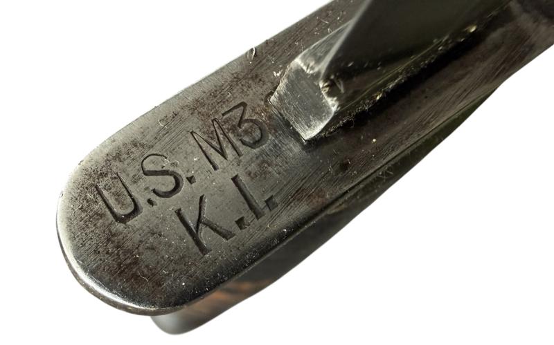 U.S. 3rd Model M3 Trench Knife and M8 Scabbard in nice used condition with great patina. Compromising the so-called 3rd model and being makers marked on the hilt. Clearly marked U.S. M3 and "K.I." on the crossguard (Kinfolks, Inc.) and marked on the pommel with Ordnance bomb on the pommel. The M8 scabbard clearly makers marked B.M. Co. And marked with a laundry number on the webbing canvas. Fitted with original leather lace. These type of knifes were widely used in the ETO and during operations such as D-Day and Normandy in 1944. A nice yet light used 3rd model M3 trench knife by a rare maker (Kinfoks produced around 135,548 M3 fighting knives during the war).