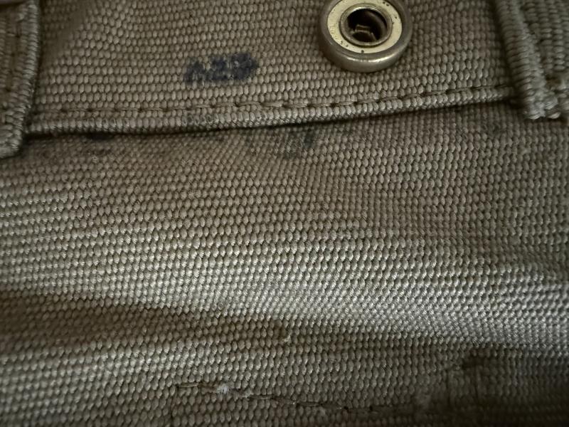 A nice set consisting of a 1937 Pattern webbing Pistol holster and ammunition pouch and brace adjuster. The webbing holster is has no visible date or makers mark. The ammunition pouch is clearly 1943 dated and makers marked Finnigans. The brace adjuster is 1941 dated and marked with Broad Arrow. IMO in unissued condition.