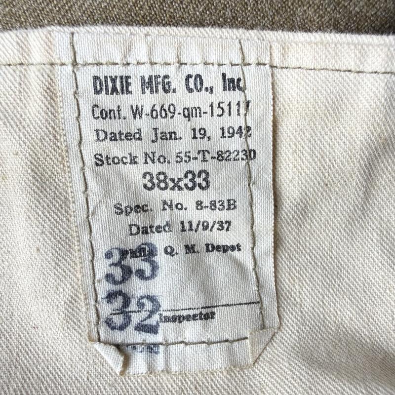 Often refered to as "mustard" trousers. The trousers are fitted with clear label. Makers marked Dixi MFG Co. Inc and dated 1942. The trousers compromise a size 38 waist and 33 inseam. some very small moth holes A very nice pair of U.S. Army M‑1937 Wool Service Trousers that would be hard to upgrade!