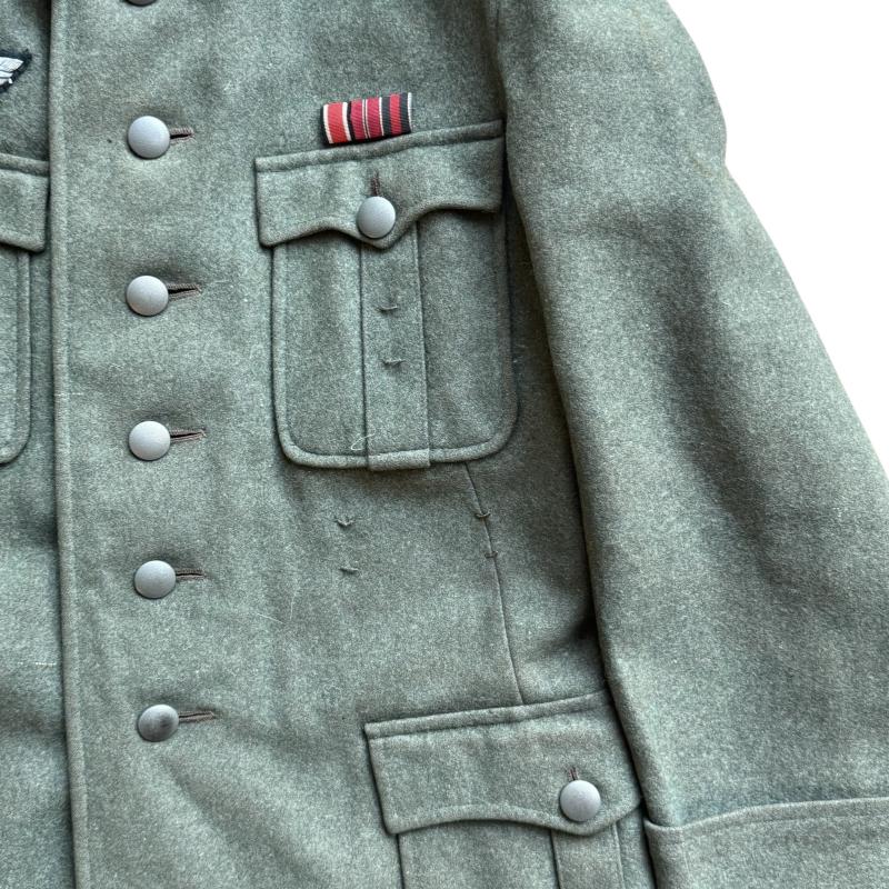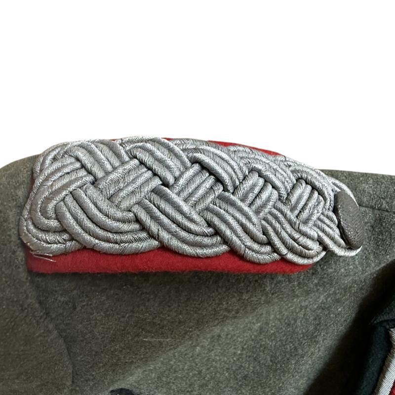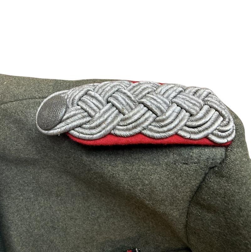 Wehrmacht (Heer) Officer's Tunic as intended for an 'Major der Artillerie'. This is a nice quality, 'privately purchased' M36-style field-grey wool tunic. The tunic is overall nice used condition and with a stunning patina! The tunic is complete with all insignia, including a hand-embroidered breast-eagle, shoulder boards and officer's type collar tabs. Both the collar tabs and shoulder-boards are piped in the red 'Truppenfarbe' indicating the Artillery. The shoulderboards are sewn in and indicate a Major der Artillerie. The tunic is fitted with ribbons for 2nd Class Iron Cross and Ostmedaille. The tunic a decent mannequin size. A highly attractive WH (Heer) Artillery Officer's Field Blouse.