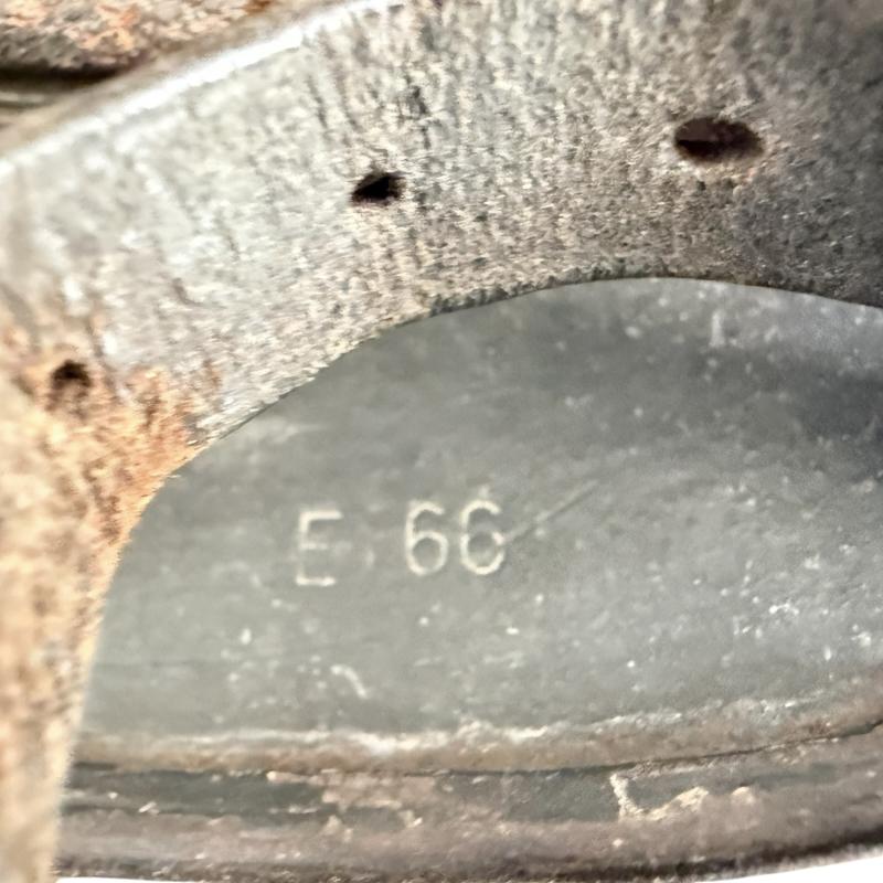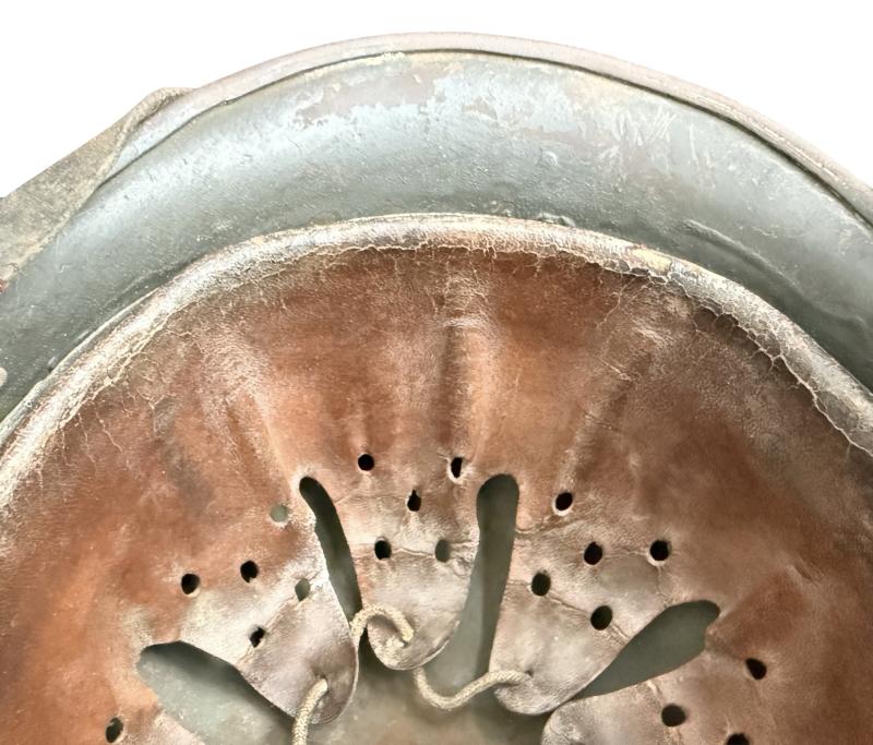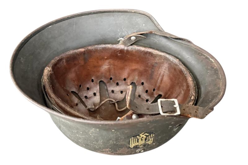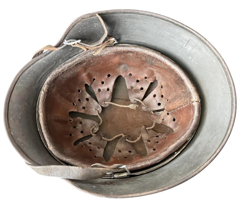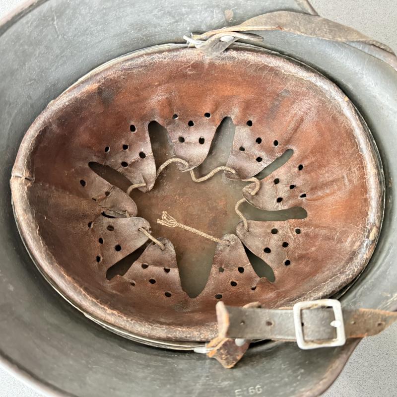 The helmet is market ET66 which indicates production by the company of Eisenhuttenwerk AG, Thale Harz and size 66. The helmet is marked with serial number 3960 in the neckguard. The original leather liner is present and equal nice used condition with all seven extended fingers being present. The helmet is fitted with original brown leather chinstrap makers marked Carltesch Berlin and 1937 dated. An nice used WH (HEER) M35 Single Decal Combat Helmet that can be upgraded.