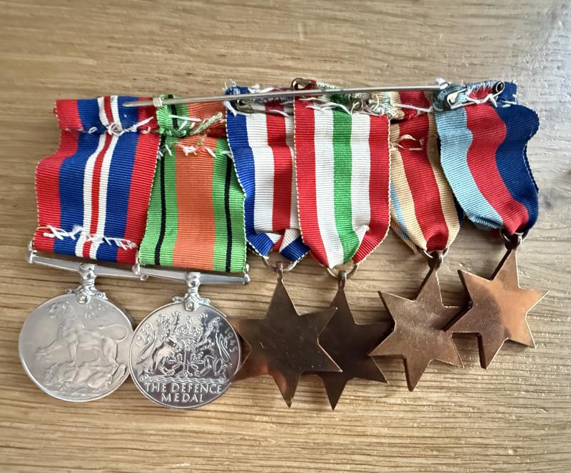 Medaille set; 39-45 star, Africa star, italy star, france & germany star, war and defence medal. Named cardboard medalbox.