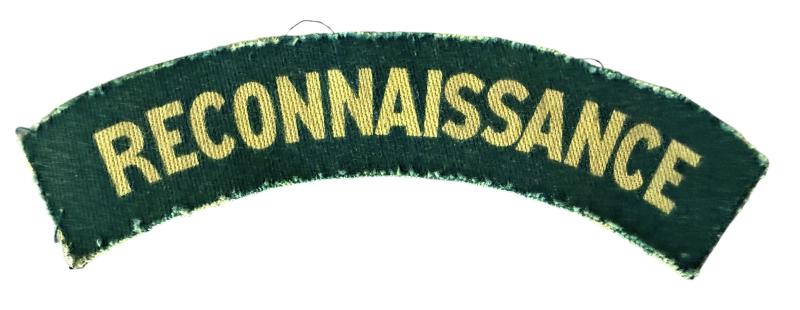 A mint and increasingly hard to find pair of Reconnaissance Corps Shoulder Titles. A fully matching and printed pair. Cannot be upgraded.